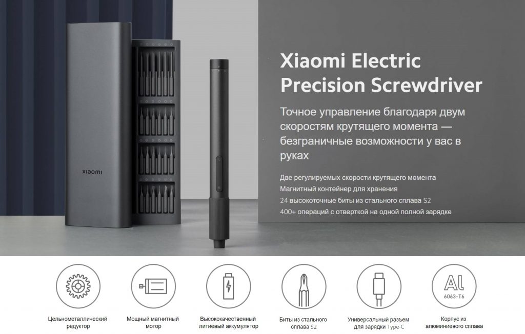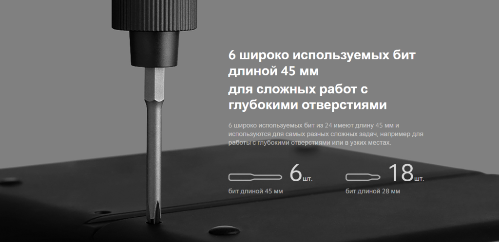 Комплектация | отвертка, биты для отвертки 24 шт., кабель для зарядки USB Type-C, контейнер для хранения, документация |