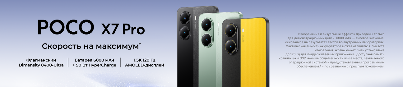 Poco X7 Pro — новое слово в мире смартфонов. Оснащенный флагманским процессором MediaTek Dimensity 8400-Ultra, он обеспечивает невероятную производительность для игр, многозадачности и работы с приложениями. Яркий 1.5К AMOLED-дисплей с частотой 120 Гц и технологией CrystalRes поражает четкостью и плавностью изображения. Основная камера на 50 Мп с оптической стабилизацией (OIS) позволяет создавать профессиональные снимки даже в сложных условиях. Защита IP68 гарантирует устойчивость к воде и пыли, а емкий аккумулятор на 6000 мАч с поддержкой 90-ваттной быстрой зарядки HyperCharge обеспечивает долгую работу без простоев.
